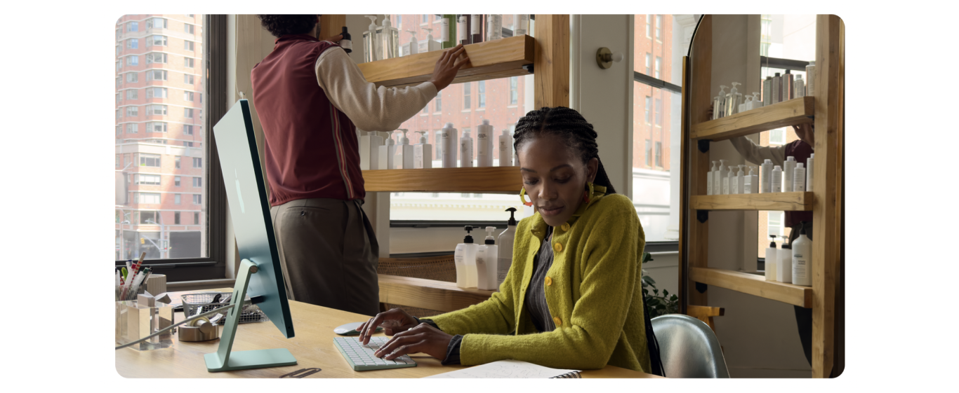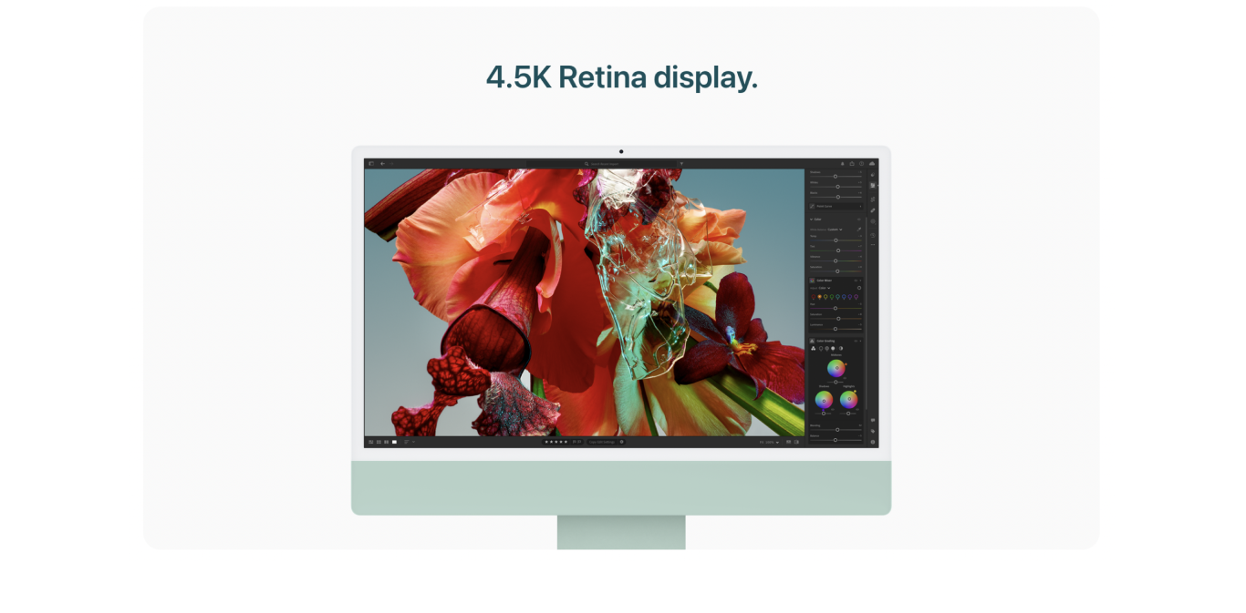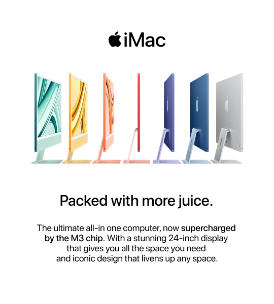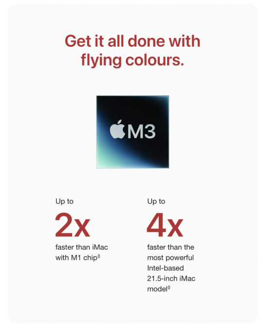 Performance Compared with Intel‑Based 21.5‑inch iMac Model: Testing conducted by Apple in September and October 2023 using pre-production 24‑inch iMac systems with Apple M3, 8‑core CPU and 10‑core GPU, as well as production 3.0GHz 6‑core Intel Core i5–based 21.5-inch iMac systems with Radeon Pro 560X with 4GB of GDDR5 memory, all configured with 8GB of RAM and 256GB SSD. Tested using Super Resolution with Photomator 3.1.2 and a 4.4MB image. Performance tests are conducted using specific computer systems and reflect the approximate performance of iMac.
