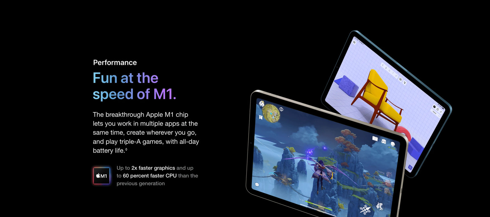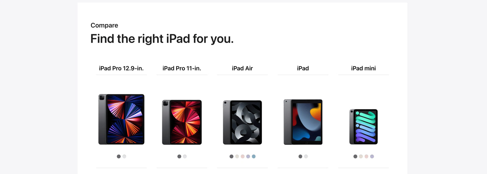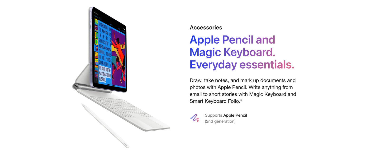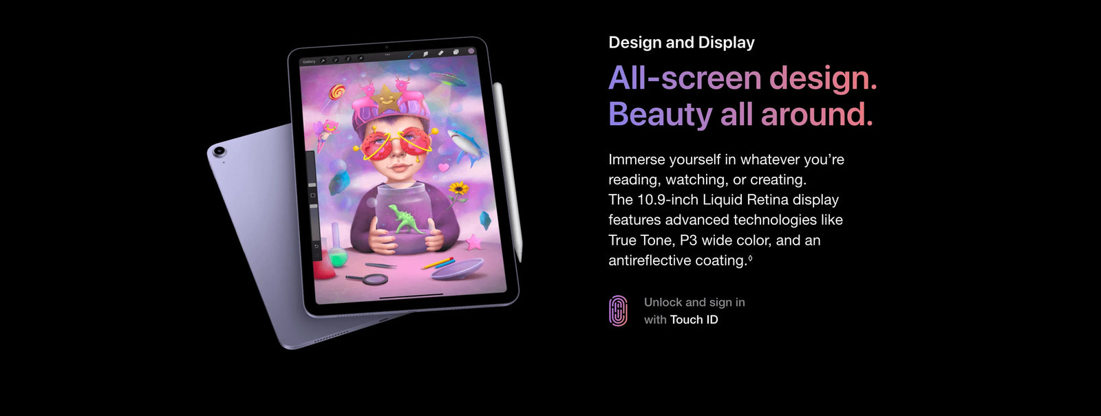 Display: The displays have rounded corners. When measured diagonally as a rectangle, the iPad Pro 12.9‑inch screen is 12.9 inches; the iPad Pro 11‑inch screen is 11 inches; the iPad Air screen is 10.86 inches; and the iPad mini screen is 8.3 inches. Actual viewable area is less.