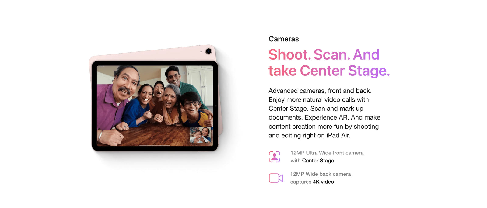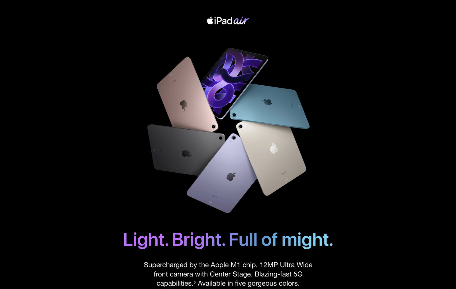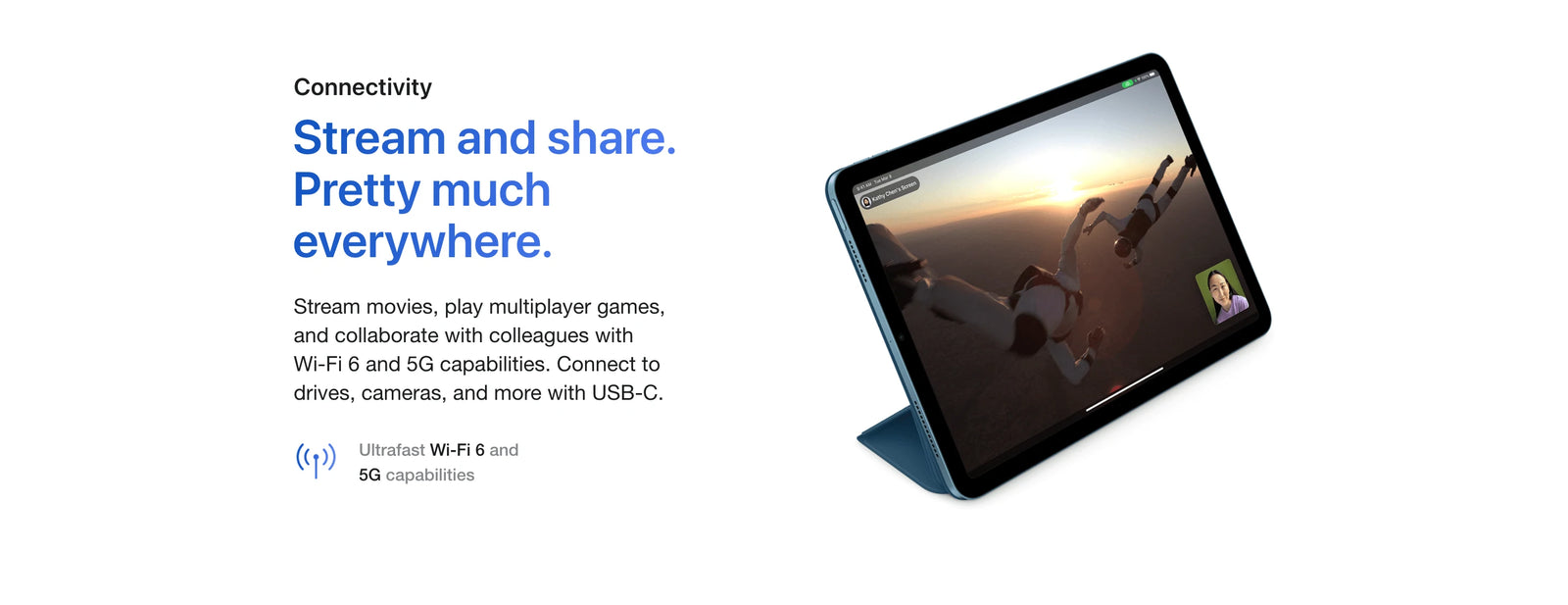 Cellular and Wireless: Data plan required. 5G and 4G LTE are available in select markets and through select carriers. Speeds vary based on site conditions and carrier. For details on 5G and LTE support, contact your carrier and see apple.com/ipad/cellular.