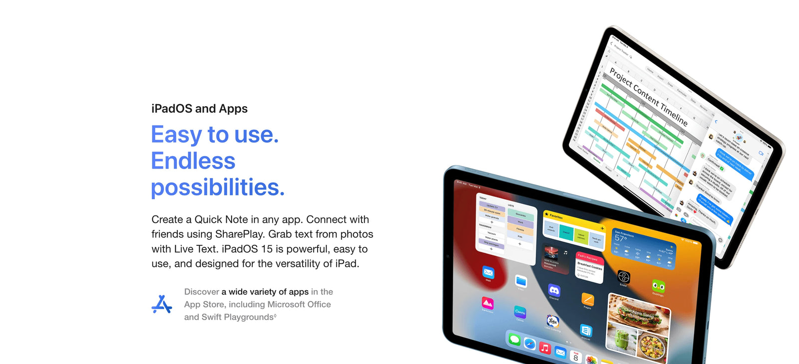 Capacity: Available space is less and varies due to many factors. A standard configuration uses approximately 12GB to 17GB of space, including iPadOS 15 with its latest features and Apple apps that can be deleted. Apple apps that can be deleted use about 4.5GB of space, and you can download them back from the App Store. Storage capacity subject to change based on software version, settings, and iPad model.