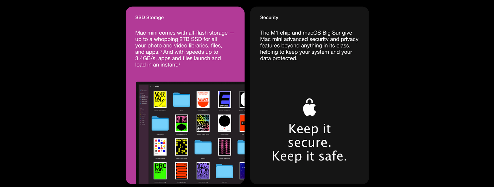 Testing conducted by Apple in October 2020 using preproduction Mac mini systems with Apple M1 chip and 16GB of RAM and 2TB SSD. Tested with FIO 3.23, 1024KB request size, 150GB test file and IO depth=32. Performance tests are conducted using specific computer systems and reflect the approximate performance of Mac mini.