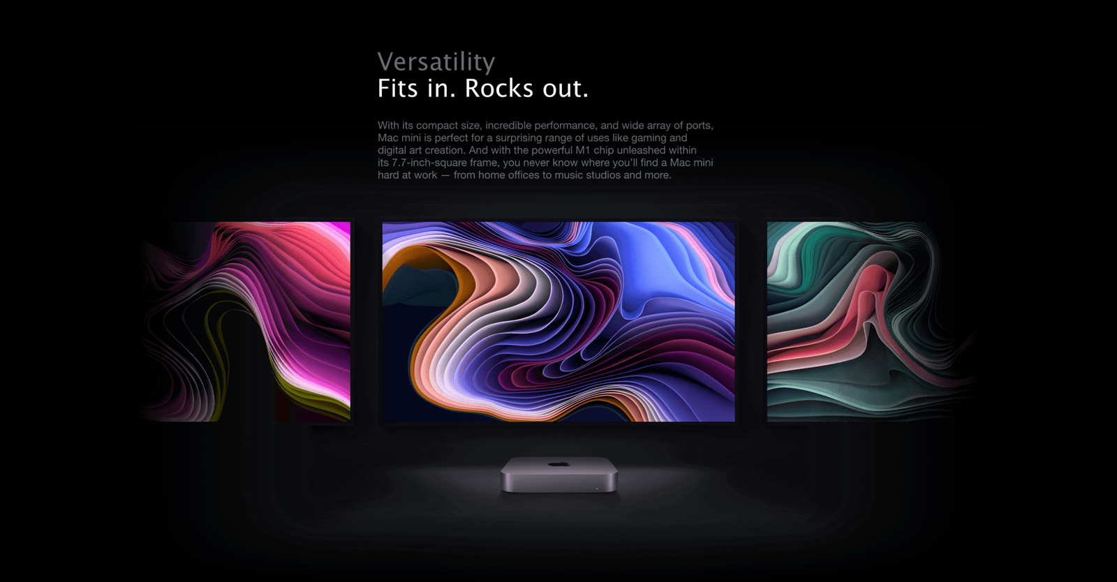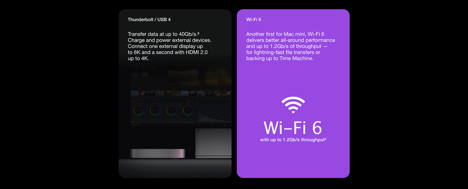 Testing conducted by Apple in October 2020 using a preproduction Mac mini with Apple M1 chip, 16GB of memory, 2TB SSD, and LG UltraFine 5K Display, and a shipping Mac mini with a 6-core Intel Core i7 processor, 8GB of memory, 512GB SSD, and LG UltraFine 5K Display. Energy consumption was measured during wireless browsing of top websites.1TB = 1 trillion bytes; actual formatted capacity less.
