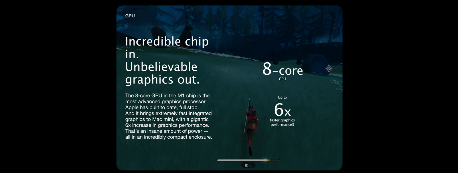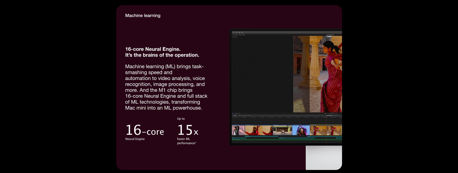 Testing conducted by Apple in October 2020 using preproduction Mac mini systems with Apple M1 chip, and production 3.6GHz quad-core Intel Core i3-based Mac mini systems with Intel Iris UHD Graphics 630, all configured with 16GB of RAM and 2TB SSD. Prerelease Final Cut Pro 10.5 tested using a complex 2-minute project with a variety of media up to 4K resolution. Performance tests are conducted using specific computer systems and reflect the approximate performance of Mac mini.