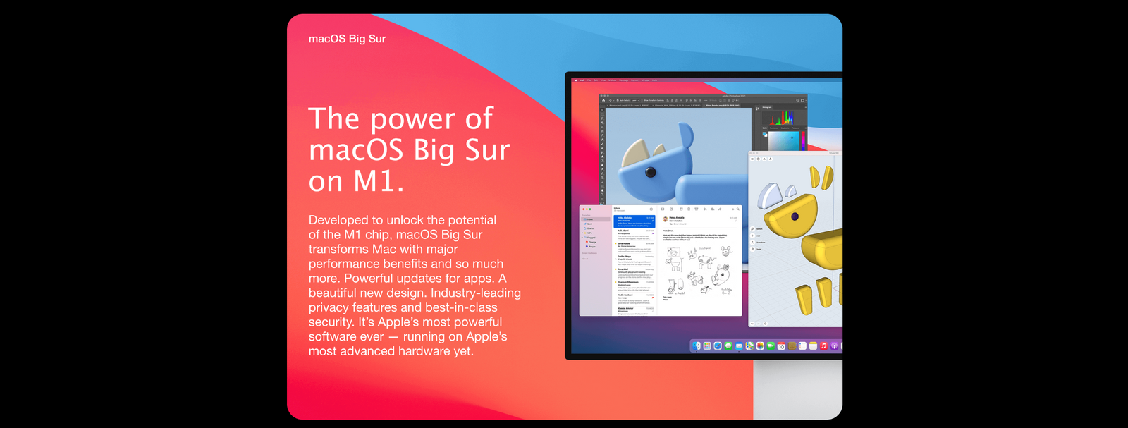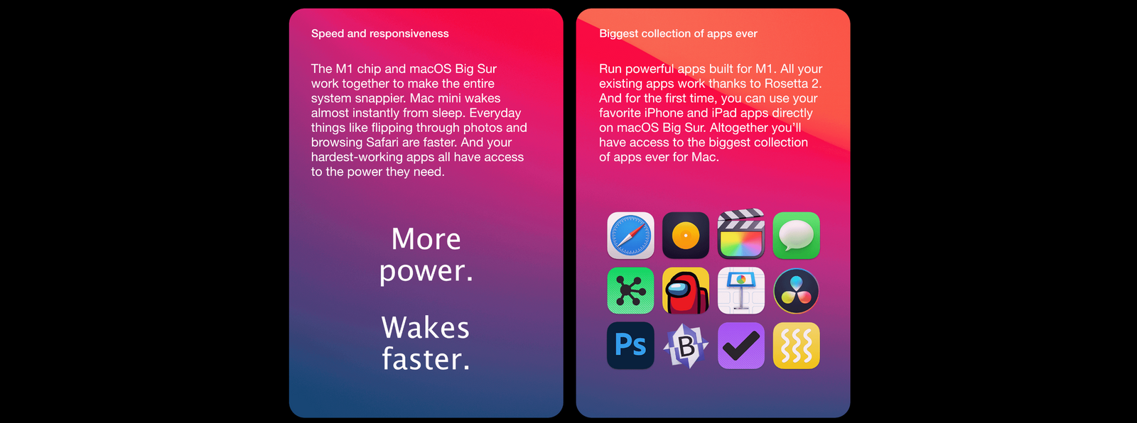Testing conducted by Apple in October 2020 using preproduction Mac mini systems with Apple M1 chip, and production 3.6GHz quad-core Intel Core i3-based Mac mini systems, all configured with 16GB of RAM and 2TB SSD. Prerelease Pixelmator Pro 2.0 Lynx tested using a 216KB image. Performance tests are conducted using specific computer systems and reflect the approximate performance of Mac mini.