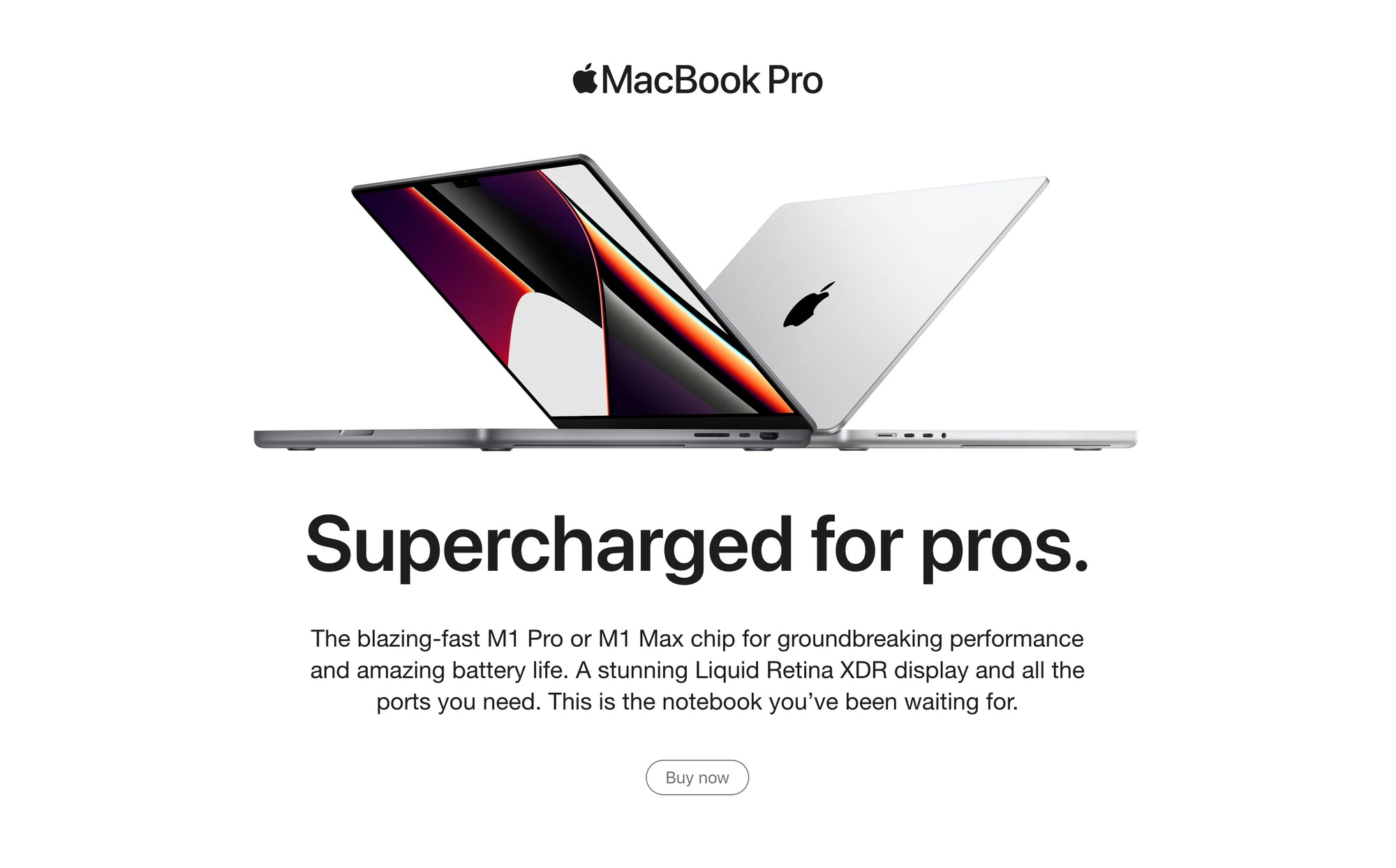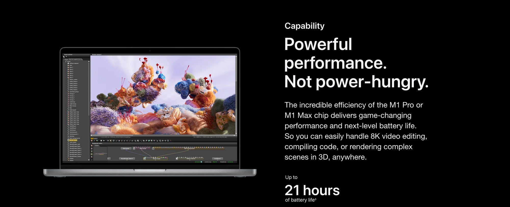 Power and Battery: Testing conducted by Apple in September 2021 using preproduction 16-inch MacBook Pro systems with Apple M1 Pro, 10-core CPU, 16-core GPU, 16GB of RAM, and 1TB SSD. The Apple TV app movie playback test measures battery life by playing back HD 1080p content with display brightness set to 8 clicks from bottom. Battery life varies by use and configuration. See apple.com/batteries for more information.