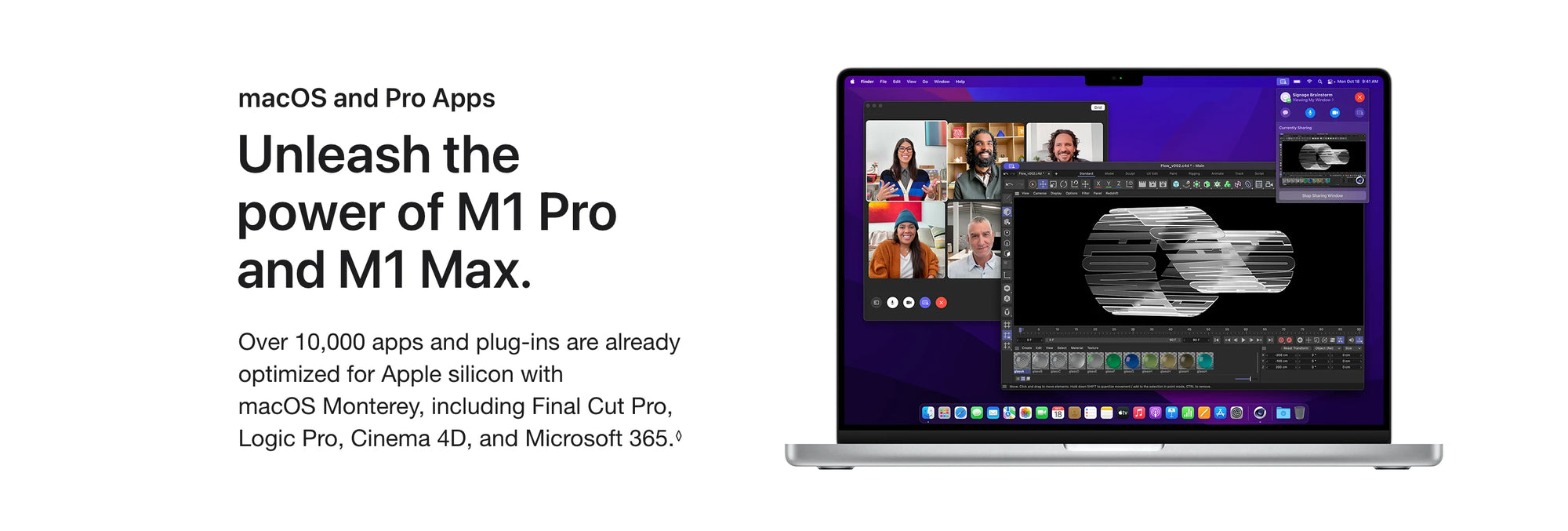 Testing conducted by Apple in September 2021 using preproduction 16-inch MacBook Pro systems with Apple M1 Pro, 10-core CPU, 16-core GPU, 32GB of RAM, and 8TB SSD. Prerelease Final Cut Pro 10.6 tested using a 1-minute picture-in-picture project with 20 streams of Apple ProRes 422 video at 3840x2160 resolution and 29.97 frames per second. Performance tests are conducted using specific computer systems and reflect the approximate performance of MacBook Pro.