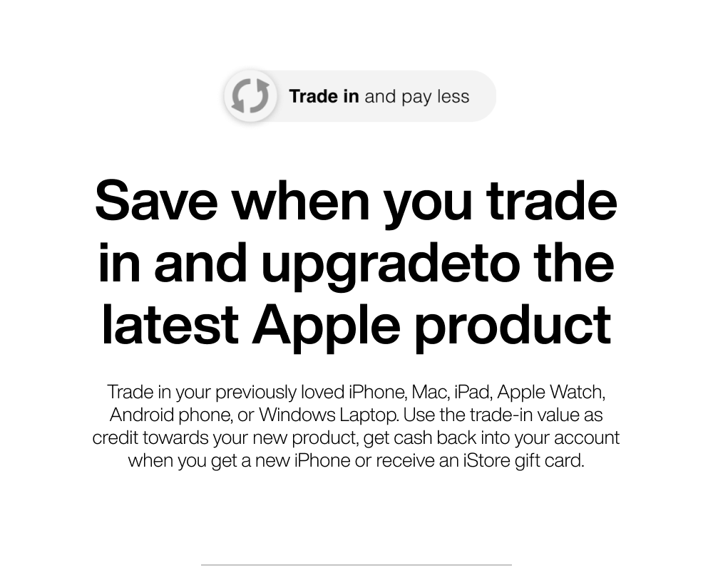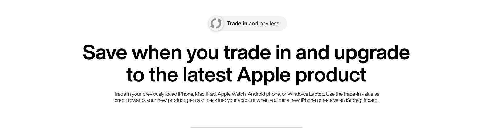 You can trade in your previously loved iPhone, Mac, iPad, Apple Watch, Android phone or Windows Laptop.