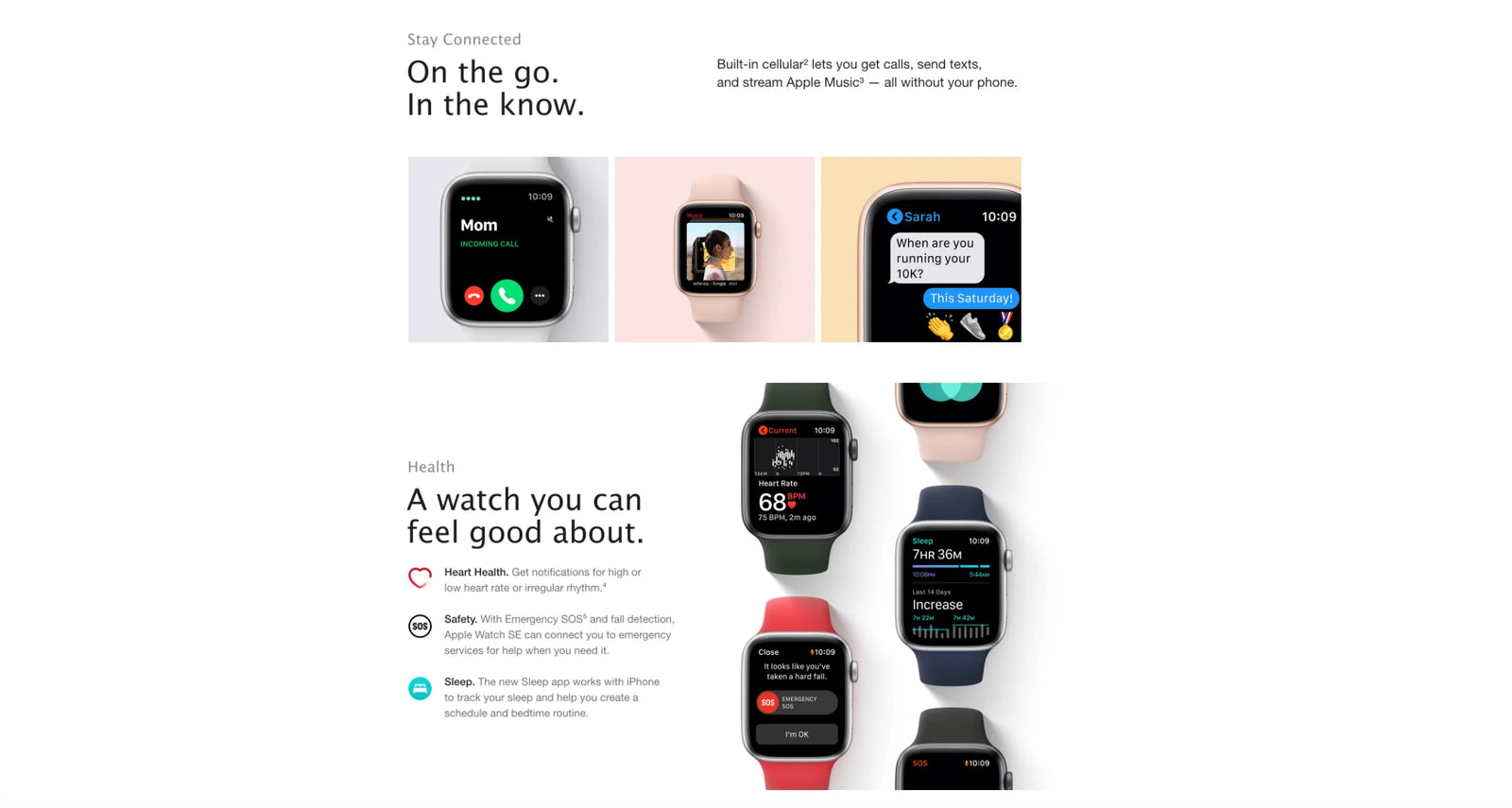 4. Apple Watch Series 6 (GPS + Cellular) and Apple Watch SE (GPS + Cellular) can use a cellular connection for Emergency SOS. To use Emergency SOS on an Apple Watch without cellular, your iPhone needs to be nearby. If your iPhone isn’t nearby, your Apple Watch needs to be connected to a known Wi-Fi network and you must set up Wi-Fi Calling.